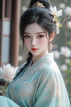 ,Textured skin,skin particles,masterpiece,best quality,8K,official art,ultra high res,1girl,chinese clothes,hanfu,jewelry,hair ornament,upper body,solo,earrings,flower ocean,remains,flower,black hair,necklace,teeth,hair bun,dress,parted lips,hair flower,((full body)),dress,hanfu,embroidery,exquisite,meticulous,(tulle:1.4),