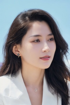 1girl, solo, looking at viewer, smile, brown hair, brown eyes, jewelry, closed mouth, upper body, earrings, lips, blue background, portrait, realistic, nose<lora:EMS-381769-EMS:0.800000>