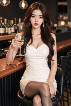 1girl, solo, long hair, breasts, looking at viewer, black hair, dress, bare shoulders, brown eyes, jewelry, sitting, full body, pantyhose, earrings, indoors, black footwear, white dress, high heels, cup, lips, strapless, makeup, chair, table, crossed legs, lipstick, holding cup, strapless dress, alcohol, drinking glass, red lips, wine glass, stool, bar \(place\), bar stool