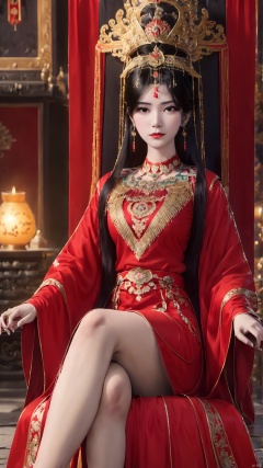 1girl, jewelry, sitting, earrings, ring, solo, dress, crossed legs, bare legs, black hair, throne, looking at viewer, chinese clothes, red dress, crown, wide sleeves, long sleeves, long hair, forehead mark, anklet, blurry background