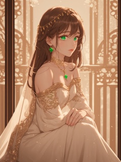 1 girl, A Central Asian princess, she has emerald eyes, brown hair, white dress, and some gold jewelry inlaid with green gems on her head. She looks sideways into the distance, In the background is a palace, hime cut, sitting sideways, an extremely delicate and beautiful, an extremely delicate and beautiful, an extremely delicate and beautiful girl, extremely detailed, beautiful detailed eyes, bare shoulder, detailed light, shine, hairs between eyes,  <lora:Festive_Bokeh_Anime:0.8>