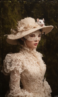 A medium close-up of a hubggirl. She is wearing a lace filigree needle point mask that is intricately painted and sewn, giving a dreamy gothic look. Her hat is ultra detailed lace with fine decorative stitching and has an ultra-fluffy white tiny mouse on the brim. The atmosphere, environment, and material textures all have a stained wet looking mossy appearance. She has a ruddy complexion with pink lipstick. Her dress is extravagant and she gives the impression of an elegant girl, a female spy, a haunting beautiful young woman, and a super-hero girl. She is also like a mistress in a burnt umber red rococo style. There is a broad brimmed white hat and an ultra close-up of a tiny little door mouse in a raindrop on the brim of her hat. The overall photo is a half body shot with 8k resolution and a photoshop render.