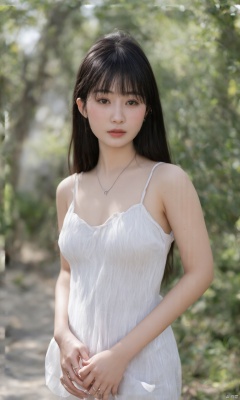 A beautiful hubggirl with very detailed features. She has pale skin that has a shy blush on her cheeks. Her long black hair is sleek and flowing, with bangs framing her face. Her eyes are beautiful and delicate, and her expression is soft and shy. She is wearing a small necklace, adding a touch of elegance. She is standing in a pose for a half body front shot, looking dreamy and elegant. The light shining on her is soft and beautiful, enhancing her overall appearance.
