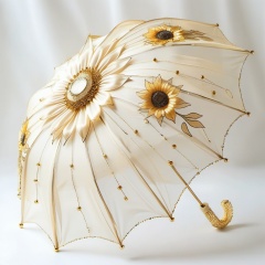 san, umbrella,A snazzy, cream-colored parasol flaunts a massive, eye-catching sunflower design. The petals, crafted from sheer fabric, are decked out with gold bead bling and tiny sequins. The parasol's handle is jazzed up with gold sequins too, adding a posh, vintage vibe. The background is plain white, making the parasol's fancy details and intricate craftsmanship stand out.,<lora:sanv1:0.8>