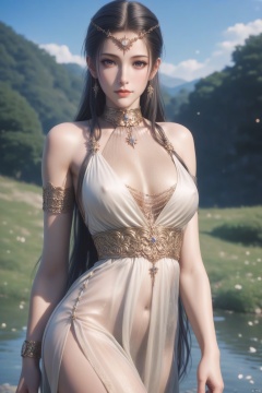 ,1girl,detailed face,solo,black hair,long hair,outdoor,dress,looking at viewer,pale skin,translucent,high detailed  skin,(detailed skin:1.1),