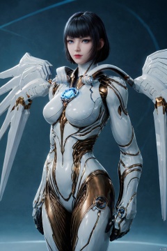 score_9_up,score_8_up,score_7_up, (Clear lines, high definition, Best quality, Very detailed, masterpiece, 4K),1girl, solo, breasts, looking at viewer, short hair, bangs, blue eyes, black hair, medium breasts, standing, wings, lips, bodysuit, science fiction, realistic, nose, mechanical wings, power armor,JiQing