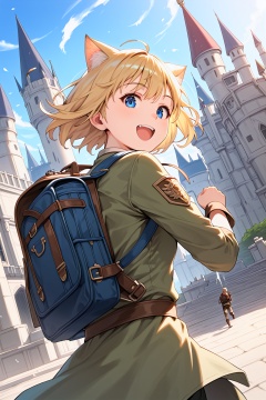 score_9, best quality,1girl,solo,(fantasy,adventurer:1.2),blonde short hair, soldier,(cat ears:0.8),from back, backpack,   looking at viewer,(kind smile:0.6),castle,upper body,dynamic, motion,wind,running,talk,open mouth,blue eyes,face,from below,dutch angle