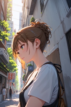 score_9,best quality, 1girl,upper body,eyes,casual,street,nature,backlit,from below