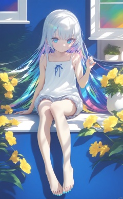 masterpiece,best quality,high quality,(colorful),loli,Yellow flowers,Blue wall,Closed windows,1girl,nail_polish,toenail_polish,barefoot,blue_nails,toenails,bloomers,solo,aqua_nails,feet,sitting,long_hair,linen hair,bare legs,barefoot,bare legs,sit on the ground,