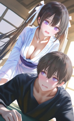 masterpiece,best quality,high quality,(colorful),(artist:ningen_mame:0.9),(artist:sho_(sho_lwlw):0.9),(artist:rhasta:0.9),(artist:wlop:0.7),(artist:ke-ta:0.6),(fkey:0.5),(tianliang duohe fangdongye:0.5),(hiten \(hitenkei\):0.6),1girl, 1boy, kimono, japanese clothes, blush, long hair, twintails, breasts, open mouth, cleavage, white kimono, purple eyes, black hair, barefoot, ribbon, hair ribbon, very long hair, wavy mouth, yukata, brown hair, long sleeves, white ribbon, dutch angle, hair between eyes, indoors, looking at another, hetero, collarbone, black shirt, all fours, large breasts