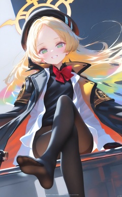 masterpiece,best quality,high quality,(colorful),(artist:ningen_mame:0.9),(artist:sho_(sho_lwlw):0.9),(artist:rhasta:0.9),(artist:wlop:0.7),(artist:ke-ta:0.6),(fkey:0.5),(tianliang duohe fangdongye:0.5),(hiten \(hitenkei\):0.6),1girl, green eyes, pantyhose, solo, feet, halo, black coat, blonde hair, long hair, gloves, black pantyhose, toes, black gloves, coat, looking at viewer, legs, thighband pantyhose, holding, smile, open coat, no shoes, black shirt, sitting, crossed legs, hat, black headwear, bow, red bow, yellow halo, beret, long sleeves, open clothes, soles, bowtie, full body, shirt, grin, blush, red bowtie, dutch angle