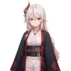 (white background:1.2),looking at viewer,(SOLO:1.4),outline,simple background,upper body, cowboy shot,looking at viewer,(((arms at side))),  fu hua,long hair, bangs, hair ornament, red eyes, hair between eyes, white hair, multicolored hair, streaked hair, smile, small breasts, red hair, pink hair,low-tied long hair,short kimono,jewelry,print kimono,pink kimono,long sleeves,kimono,japanese clothes,<lora:feiyue-pony:0.8>