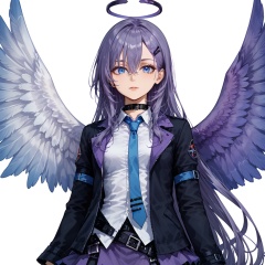 (white background:1.2),looking at viewer,(SOLO:1.4),outline,simple background,upper body, cowboy shot,looking at viewer,(((arms at side))),  fu hua,long hair,bangs,blue eyes,hair between eyes,hair ornament,purple hair,blue hair,feathered wings,wings,angel wings,bangs,thighhighs,high heels,boots,bird tail,bird wings,choker,white shirt,skirt,belt buckle,necktie,open jacket,thigh holster,thigh strap,jacket,belt,hairclip,(((hairclip at left,hairstyles that expose the left ear,))),<lora:lanque-pony:0.8>
