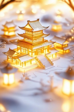 Microarchitecture,juanzhou,A digital art piece featuring a glowing, golden temple decked out in traditional East Asian style, surrounded by snow-covered trees and lanterns. The temple, all fancy with tiered roofs, sits in a snowy, chill landscape, with warm, golden lights casting a cozy glow. The background's a bit blurry, giving off a peaceful, magical vibe.,<lora:juanzhouv1:0.8>