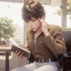 solo, looking at viewer, short hair, brown hair, shirt, black hair, long sleeves, 1boy, sitting, closed mouth, male focus, day, collared shirt, belt, pants, indoors, hand up, blurry, book, window, chair, table, sunlight, crossed legs, plant, hand on own face, open book, white pants, reading, lamp, brown shirt, blinds