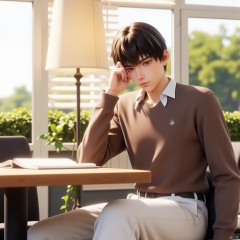 solo, looking at viewer, short hair, brown hair, shirt, black hair, long sleeves, 1boy, sitting, closed mouth, male focus, day, collared shirt, belt, pants, indoors, hand up, blurry, book, window, chair, table, sunlight, crossed legs, plant, hand on own face, open book, white pants, reading, lamp, brown shirt, blinds,sports boy