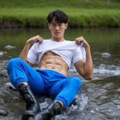 A handsome young man is lying on the water of the stream. He is wearing blue sweatpants and a white T-shirt. He lifts up his T-shirt to show off his toned abs.,sports boy