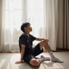 A serene and intimate shot: a young boy, hair as dark as night, sits still in a bright room. His closed eyes, a gentle curve to his face, exude peaceful contemplation. He wears simple attire - black shorts, white socks, and a deep-toned shirt that complements his dark locks. A window frames the scene, subtle watermark effect adding depth.