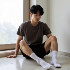 A serene and intimate shot: a young boy, hair as dark as night, sits still in a bright room. His closed eyes, a gentle curve to his face, exude peaceful contemplation. He wears simple attire - black shorts, white socks, and a deep-toned shirt that complements his dark locks. A window frames the scene, subtle watermark effect adding depth.