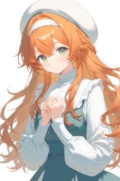 1girl, beret, braid, closed_mouth, dress, hat, long_hair, long_sleeves, simple_background, solo, white_background, white_hairband