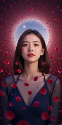 ,,meinvzi,(Good structure), DSLR Quality,Depth of field ,looking_at_viewer,Dynamic pose, , kind smile,1girl , 8k resolution, Masterpiece quality, High detail. from below, Fantasy theme, cropped. {(1 girl:1.5),(close to viewer:1.8), ((looking at viewer:2), beautiful face, ), ((worm's eye shot:1.2)),perspective distortion}, (Panoramic view, fisheye lens effect:1.1). {(Strong backlighting, underexposure:1.4), (blocked shadows:0.8), depth of field(at 100mm focal length:1.2)}, (horizon:0.7), low key earth. the starry sky feathering into the background, creating a sense of depth and gradient. Incorporating Droste Effect(an endless repetition and reflection:1.2). Surrounded by fluttering rose petals, reflected or casting dramatic shadows and highlights, {(meteor shower, planets:1.1), (Vermilion Comet:1.3)}. mesmerizing effect, a dreamlike ambiance of infinity. A vortex of rose petals, a starry sky vortex, , as, vortex, tyjf,