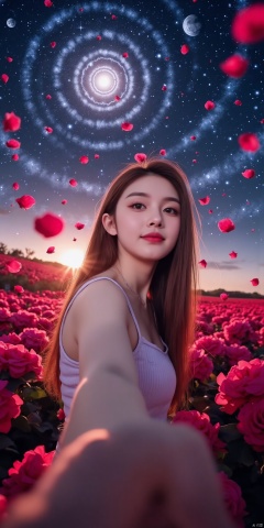 yilin, DSLR Quality,Depth of field ,looking_at_viewer,Dynamic pose, , kind smile,1girl , 8k resolution, Masterpiece quality, High detail. from below, Fantasy theme, cropped. {(1 girl:1.5),(close to viewer:1.8), ((looking at viewer:2), beautiful face, ), ((worm's eye shot:1.2)),perspective distortion}, (Panoramic view, fisheye lens effect:1.1). {(Strong backlighting, underexposure:1.4), (blocked shadows:0.8), depth of field(at 100mm focal length:1.2)}, (horizon:0.7), low key earth. the starry sky feathering into the background, creating a sense of depth and gradient. Incorporating Droste Effect(an endless repetition and reflection:1.2). Surrounded by fluttering rose petals, reflected or casting dramatic shadows and highlights, {(meteor shower, planets:1.1), (Vermilion Comet:1.3)}. mesmerizing effect, a dreamlike ambiance of infinity. A vortex of rose petals, a starry sky vortex, , as, vortex, tyjf,