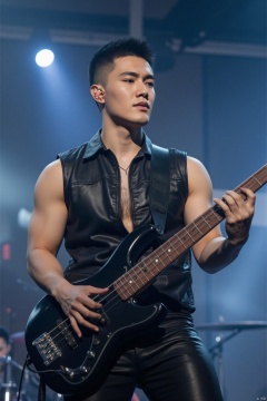 A handsome man with a very thin figure and fair skin,a rocker,short black hair,asian. he wore a punk-style leather vest, and a leather pants. dog tag,He is a muscular man. he plays electric bass on stage. Skin texture, beautiful face, skin series, clothing details, very textured photos, his movements are chic, and his expression is exciting, Real photos, stage lighting effects, thin smoke, clear focus.,jzns,zjh