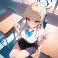 masterpiece, best quality, very aesthetic, ultra detailed,1girl, solo, overhead_view, <lora:tokiANILION-000016:0.8>, unitoki, toki, black pleated skirt, school uniform, white shirt, blue nails, looking at viewer, indoors, sunset, classroom, school desk, on chair, sitting, double v,