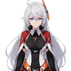 (white background:1.2),looking at viewer,(SOLO:1.4),outline,simple background,upper body, cowboy shot,looking at viewer,(((arms at side))),  kiana kaslana, k423, ponytail, symbol-shaped pupils, white hair, silver hair, hair between eyes, bangs, long hair, blue eyes, breasts, hair ornament, eyebrows visible through hair, ahoge<lora:k423-pony:0.8>