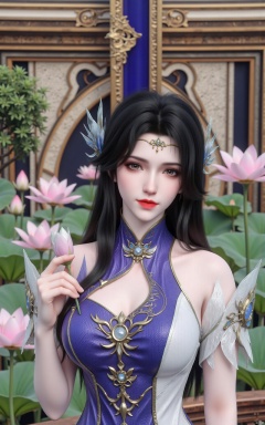 masterpiece,1girl,solo,black hair,(Standing by the lotus pond in the garden:1.3),(hanfu dress:1.3),black eyes,beautiful face,short sleeves,holding flower,looking at viewer,(huge breasts:2.79),(full breasts:1.99),Xxianyi,Xxiyouqin,Xqinghe,Xyanqingcheng,Xhongdie,Xcaoying,Xjiziyue,Xyueying,Xbaiyin81