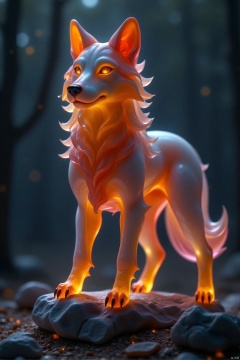 (mystical wolf-like creature,glowing golden specks,stands on rocky base,dark background,enhances luminosity,otherworldly appearance),(best quality,4k,8k,highres,masterpiece:1.2),ultra-detailed,(realistic,photorealistic,photo-realistic:1.37),ethereal glow,sharp focus,physically-based rendering,extreme detail description,professional,vivid colors,bokeh,nighttime,moonlight,shadows,rocks,crystals,glowing eyes,flowing fur,spiritual aura,ancient runes,enchanted forest,mythical,legendary,atmospheric lighting,haunting beauty,otherworldly atmosphere,celestial,unearthly,phantasmagoric,fantasy art,concept art,digital painting,HDR,UHD,studio lighting,ultra-fine painting