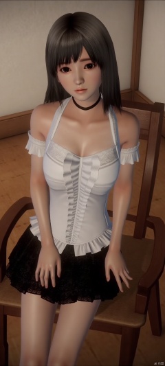 score_9_up,score_8_up,score_7_up, (high definition, Best quality, masterpiece, 4K, exquisite skin), cxshenyu, 1girl, solo, necklace, breasts,cleavage,(white off-shoulder T-shirt:1.2), (black lace skirt:1.2),sitting room,sittin on the chair,learning forward