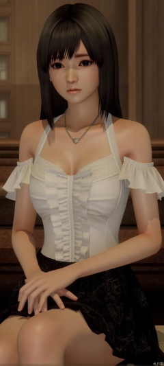 (high definition, Best quality, masterpiece, 4K, exquisite skin), cxshenyu, 1girl, solo, necklace, breasts,cleavage,(white off-shoulder T-shirt:1.2), (black lace skirt:1.2),sitting room,sittin on the chair,learning forward