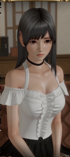 score_9_up,score_8_up,score_7_up, (high definition, Best quality, masterpiece, 4K, exquisite skin), cxshenyu, 1girl, solo, necklace, breasts,cleavage,(white off-shoulder T-shirt:1.2), (black lace skirt:1.2),sitting room,sittin on the chair,learning forward,