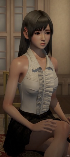 (high definition, Best quality, masterpiece, 4K, exquisite skin), (cxshenyu), solo,  black pleats skirt, sitting, room,sittin on the chair,learning forward