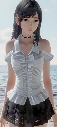 (high definition, Best quality, masterpiece, 4K, exquisite skin), cxshenyu, solo,cleavage,(white off-shoulder T-shirt:1.2),  black pleats short skirt, seaside, lie, learning forward