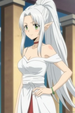 1girl, solo, long hair, breasts, looking at viewer, bangs, hair ornament, dress, cleavage, bare shoulders, jewelry, medium breasts, closed mouth, green eyes, standing, collarbone, full body, white hair, earrings, choker, pointy ears, off shoulder, white dress, bracelet, hand on hip, parted bangs, sash, elf, pelvic curtain, side slit, pillar, colum