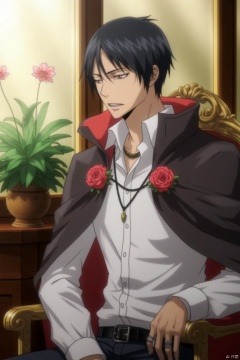 (((Vampires))),Burns, burns,Pale skin, fangs, red pupils, black-red cloak, burns, solo, short hair, shirt, black hair, long sleeves, 1boy, jewelry, sitting, closed eyes, white shirt, upper body, flower, male focus, parted lips, day, collared shirt, indoors, necklace, lips, window, profile, chair, sunlight, plant,