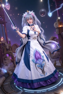 holding a sword in her right hand. She is dressed in a white top and a long skirt adorned with blue and purple accents. Her hair is long and cascades in a ponytail. Her dress is adorned with a white bow at the top of her head