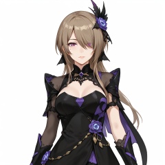 (white background:1.2),looking at viewer,(SOLO:1.4),outline,simple background,upper body, cowboy shot,looking at viewer,(((arms at side))),  rita rossweisse,covering one eye,purple eyes,mole under eye,hair over one eye,breasts,brown hair,mole,<lora:lita-pony:0.8>