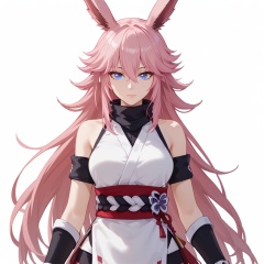 (white background:1.2),looking at viewer,(SOLO:1.4),outline,simple background,upper body, cowboy shot,looking at viewer,(((arms at side))),  yae sakura,hair between eyes,bangs,animal ears,purple eyes,pink hair,long hair,fox ears,breasts,<lora:huli-pony:0.8>