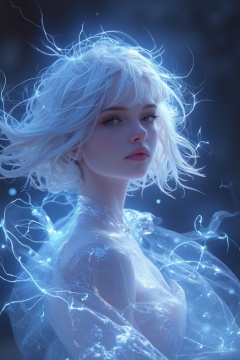 ((Highest quality)), ((masterpiece)), (detailed), A thunder spirit based on a Japanese woman, Wear lightning on your body, Wear the thunder, Dressing the Lightning, Wearing lightning,My hair is made of lightning、Personification of the spirit of thunder, Floating feeling to Fantasy, The clothes are made of lightning, Make your body semi-transparent, Overall, it is transparent and mysterious., Fluid hair, My hair is made of lightning,Fantasy, pale, delicately, Portrait, Her hair is made of lightning,Overall, the image of thunder is strengthened., The clothes are made of lightning