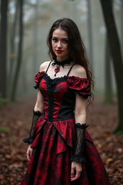 score_9, score_8_up, score_7_up, Portrait, girl, cute, seductive, innocent, light smile, plump lips, slender body, high detailed gothic dress, red|white|black, vibrant color, mistery forest background, depth of field, dynamic angle, (photo realistic:1.4), realistic skin:1.4, fashion photography, sharp, analog film grain