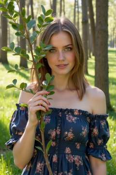 kristen_stewart standing outdoors amidst a serene, sunlit forest. She has a fair complexion, light brown hair that falls straight past her shoulders, and striking blue eyes. Her expression is soft and inviting, with a gentle smile. She is wearing an off-the-shoulder, dark blue floral dress that contrasts with her fair skin. The dress has a relaxed, bohemian style with a loose, flowing fit. She holds a branch of a leafy tree with her right hand, partially obscuring her face. The background features tall, slender trees with light green leaves, and a grassy field stretches out behind her, indicating a late spring or early summer setting. The sunlight filters through the foliage, casting dappled shadows and creating a warm, inviting atmosphere. The overall mood of the photograph is tranquil and natural, with a focus on the subject's serene beauty and connection with nature.