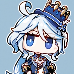 chibi,solo,<lora:nineface-chibi-A31-5:1>,1girl,furina \(genshin impact\),genshin impact,blue eyes,white hair,hair between eyes,bangs,blue hair,ahoge,bow,hat,long hair,multicolored hair,blue headwear,top hat,