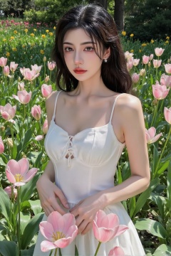 fxtjwweieiinianiaan,(best quality,4k,8k,highres,masterpiece:1.2),ultra-detailed,(realistic,photorealistic,photo-realistic:1.37),long dark hair,beautiful detailed eyes,beautiful detailed lips,extremely detailed eyes and face,long eyelashes,slim figure,delicate features,soft expression,white dress,elegant posture,standing in a garden,flowers around,gentle sunlight,soft shadows,green foliage,serene atmosphere,calm and peaceful,illustration,smooth skin,refined,graceful,attractive,gorgeous,ethereal,romantic,whimsical,fantasy,soft pastel colors,harmonious,tranquil scene,dreamy,peaceful ambiance,natural light,evening glow,