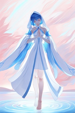 digital art illustration,Blue-haired anime character with a serene expression, wearing a flowing white dress with a blue cape, standing by the water under a soft pink sky, conveying a peaceful and mystical atmosphere.,