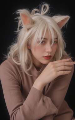 Solo hubggirl, ultra-wide view, short wavy white hair, bangs, cat ears, red eyes, long nails, long-sleeved top, black bg, dynamic light, androgynous, 1 focused elem.