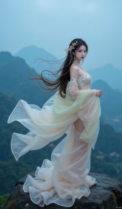 A woman in Chinese costume on the top of a mountain, charming, transparent white gauze, long hair flowing, extremely complicated jewelry, thighs, fantasy style, water drops falling on thighs, natural light, rain, Tyndall effect