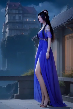 1girl, solo, long hair, black hair, hair ornament, dress, hair bun, high heels, from side, night, blue dress, building, purple dress,